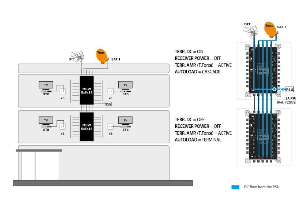 Može se koristiti kao terminal (zvjezdasta topologija) ili kao kaskada pomoću jednostavnog prekidača. Osim toga, uključuje drugi prekidač koji aktivira TForce tehnologiju, koja automatski prilagođava zemaljski signal i održava ga konstantnim unatoč varijacijama u prijemu.