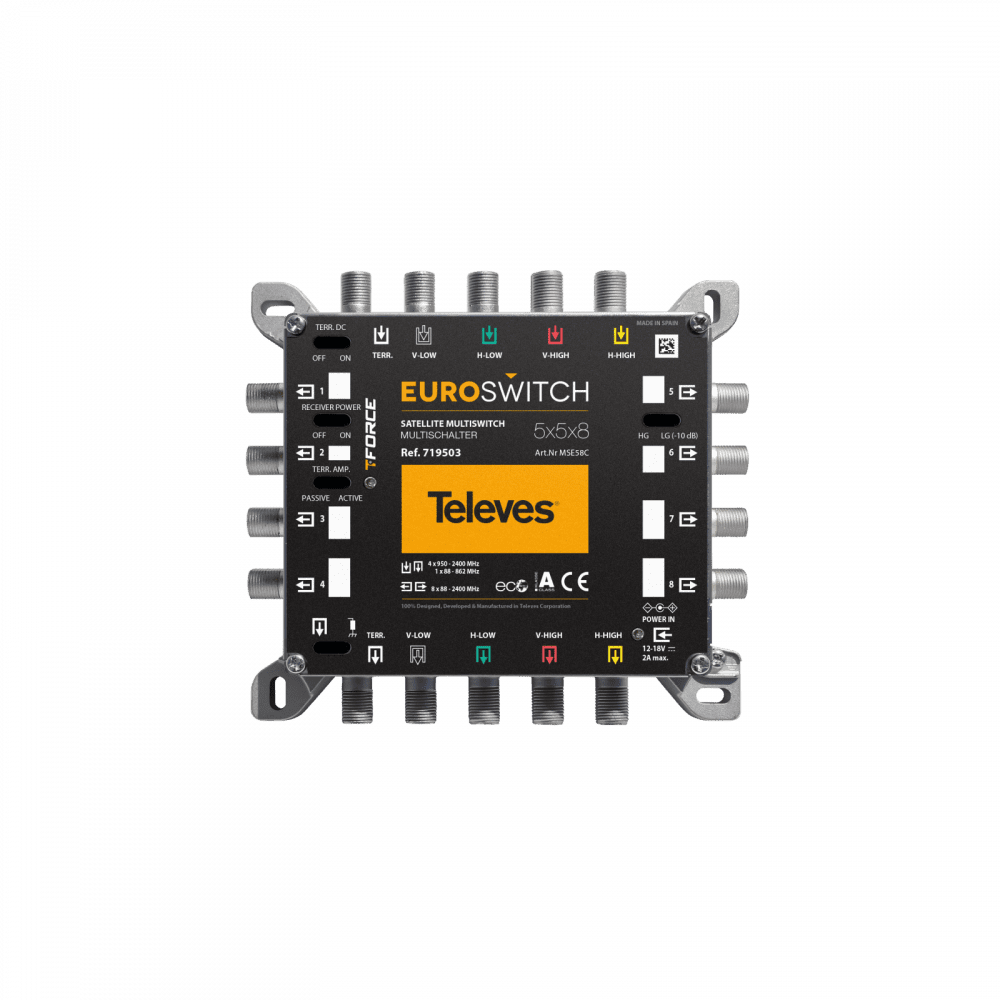 - 10 dB Low Gain (LG) / High Gain (HG) prekidač za prigušivanje satelitskog ulaznog signala za svaku grupu od 8 korisnika